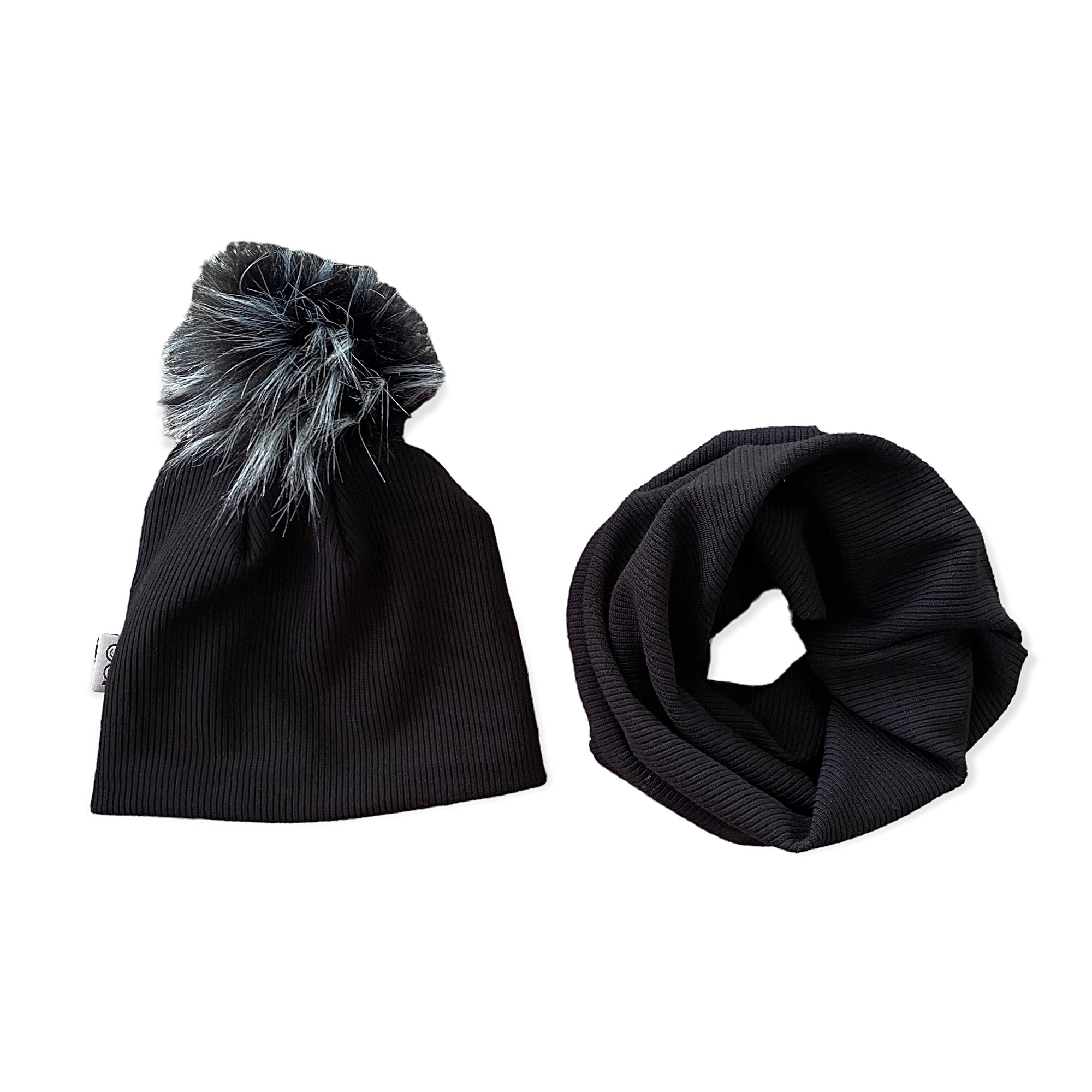 • Black Ribbed Faux Fur Pom Pom Hat and Infinity Scarf