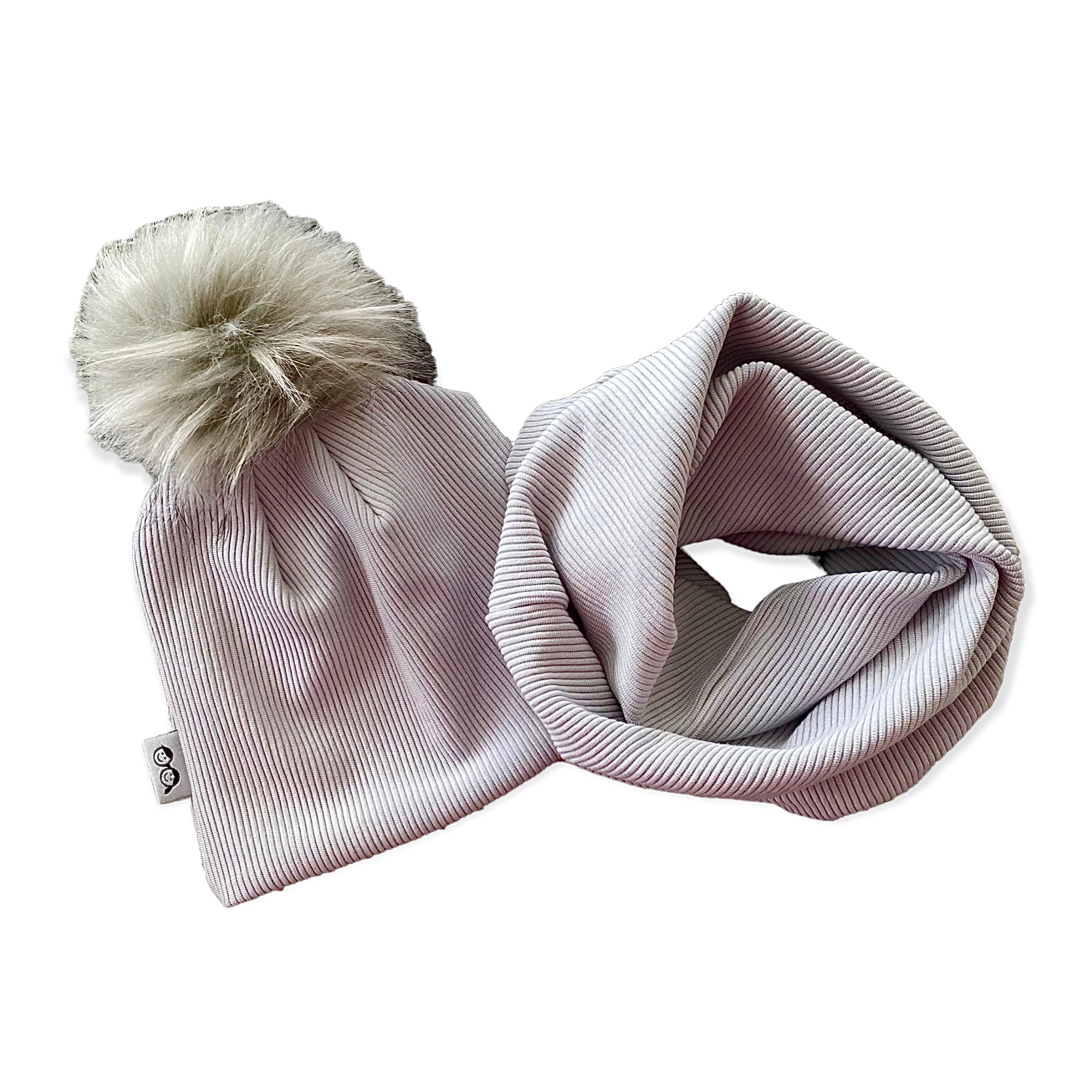 • Grey Ribbed Faux Fur Pom Pom Hat and Infinity Scarf