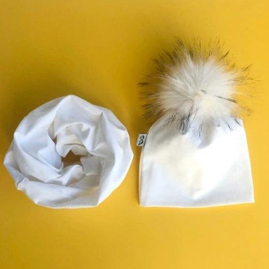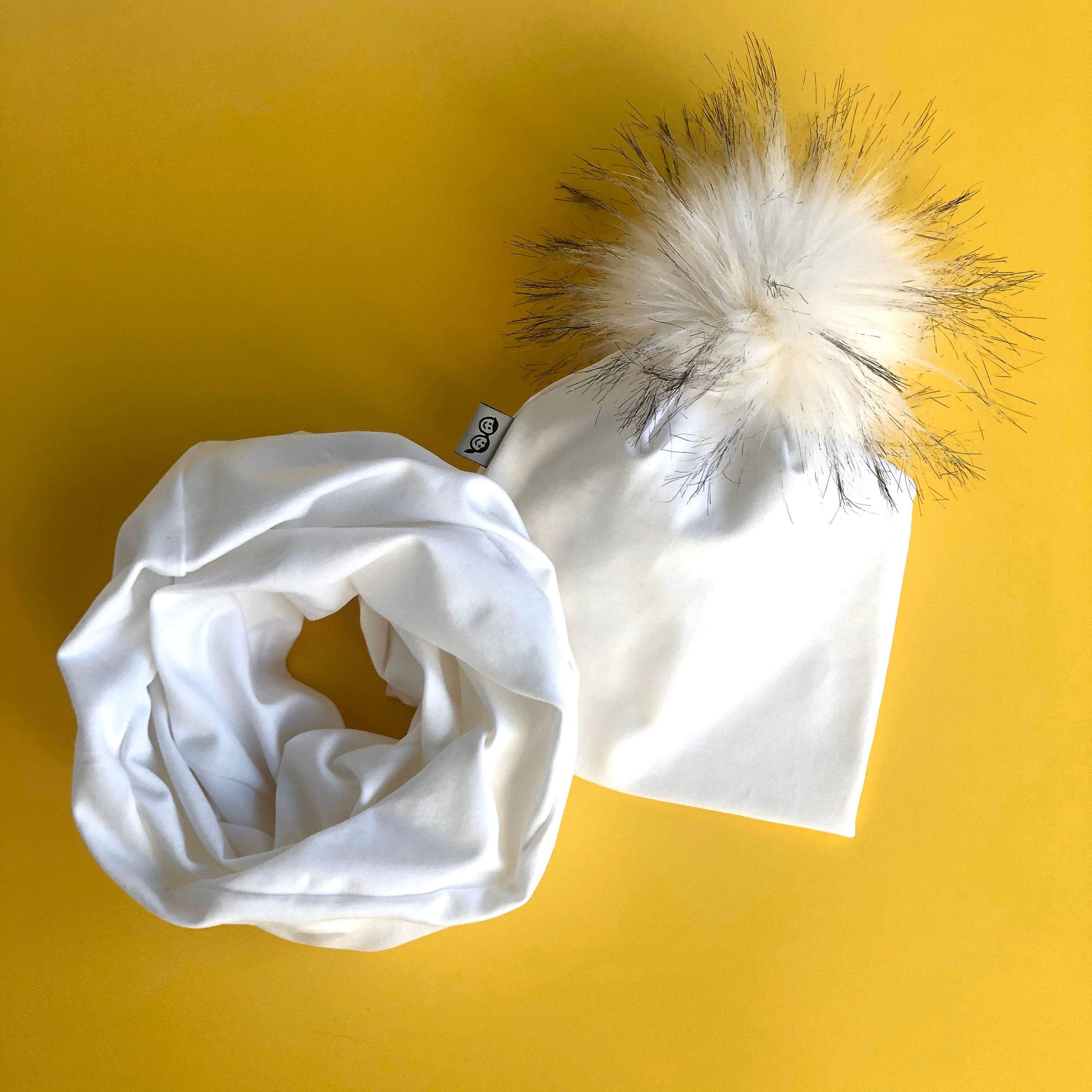 White Faux Fur Pom Pom Hat and Infinity Scarf