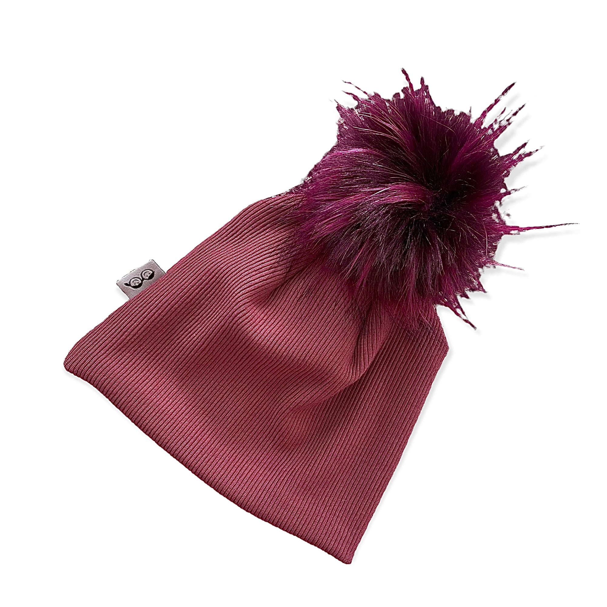 Burgundy Ribbed Faux Fur Pom Pom Hat and Infinity Scarf